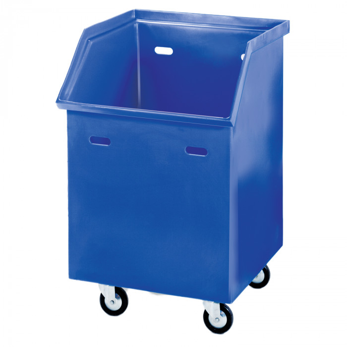 Slant front for easy loading. Square design saves space on plant floors or delivery vans. 5" casters